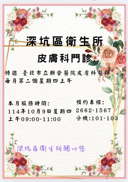 深坑區衛生所已設皮膚科門診,由新北市衛生局特請臺北市立聯合醫院皮膚科醫師至本所駐診。